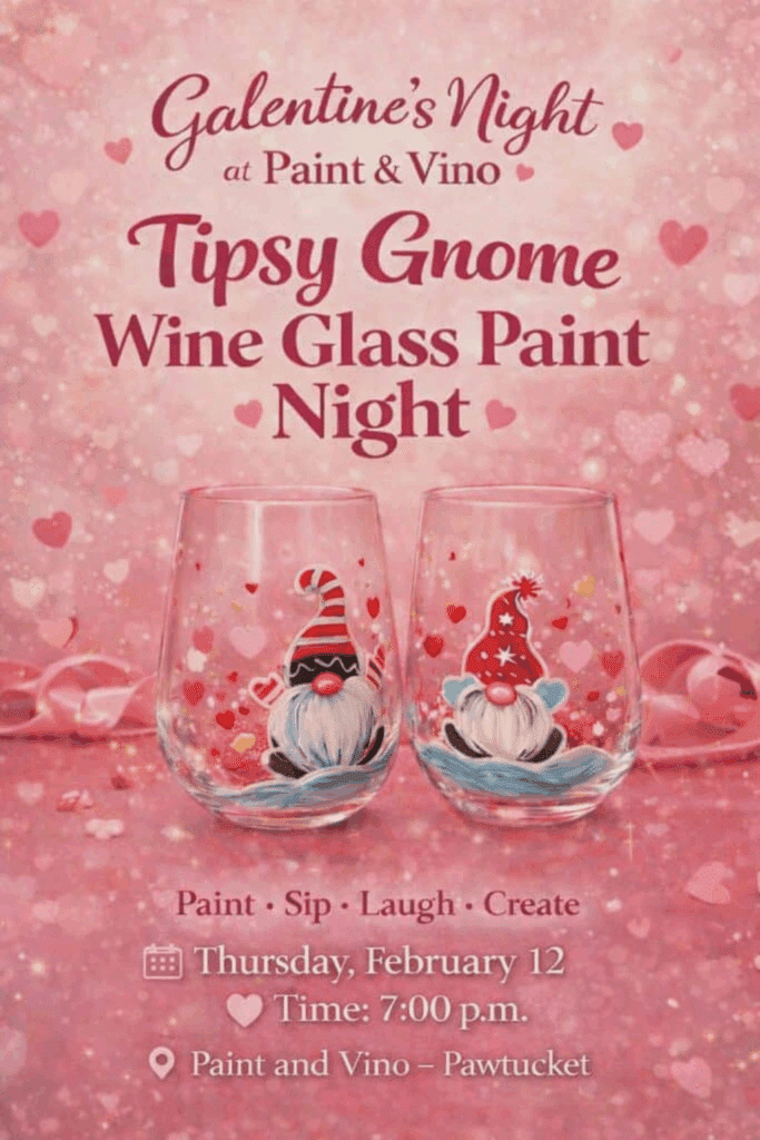 GALENTINE’S TIPSY GNOME WINE GLASS PAINT NIGHT Grab your girls and join us for a fun & festive Galentine’s Night at Paint and Vino! In this relaxed, beginner-friendly class, you’ll paint an adorable Tipsy Gnome wine glass featuring hearts, sparkle details, and Valentine vibes.
