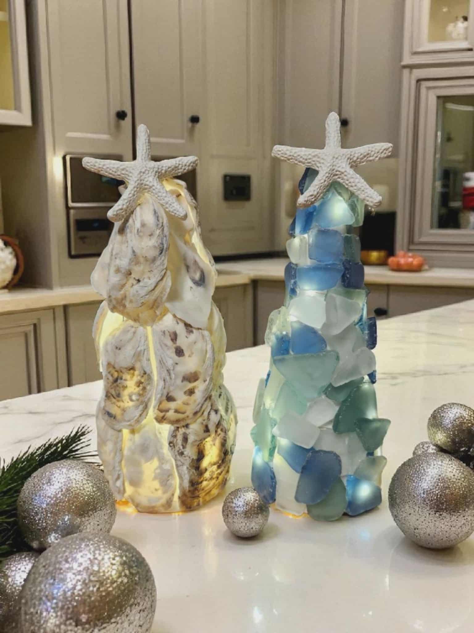 Light up your holidays with a touch of the coast! Create your own glowing tree using sea glass, shells, and starfish toppers.
