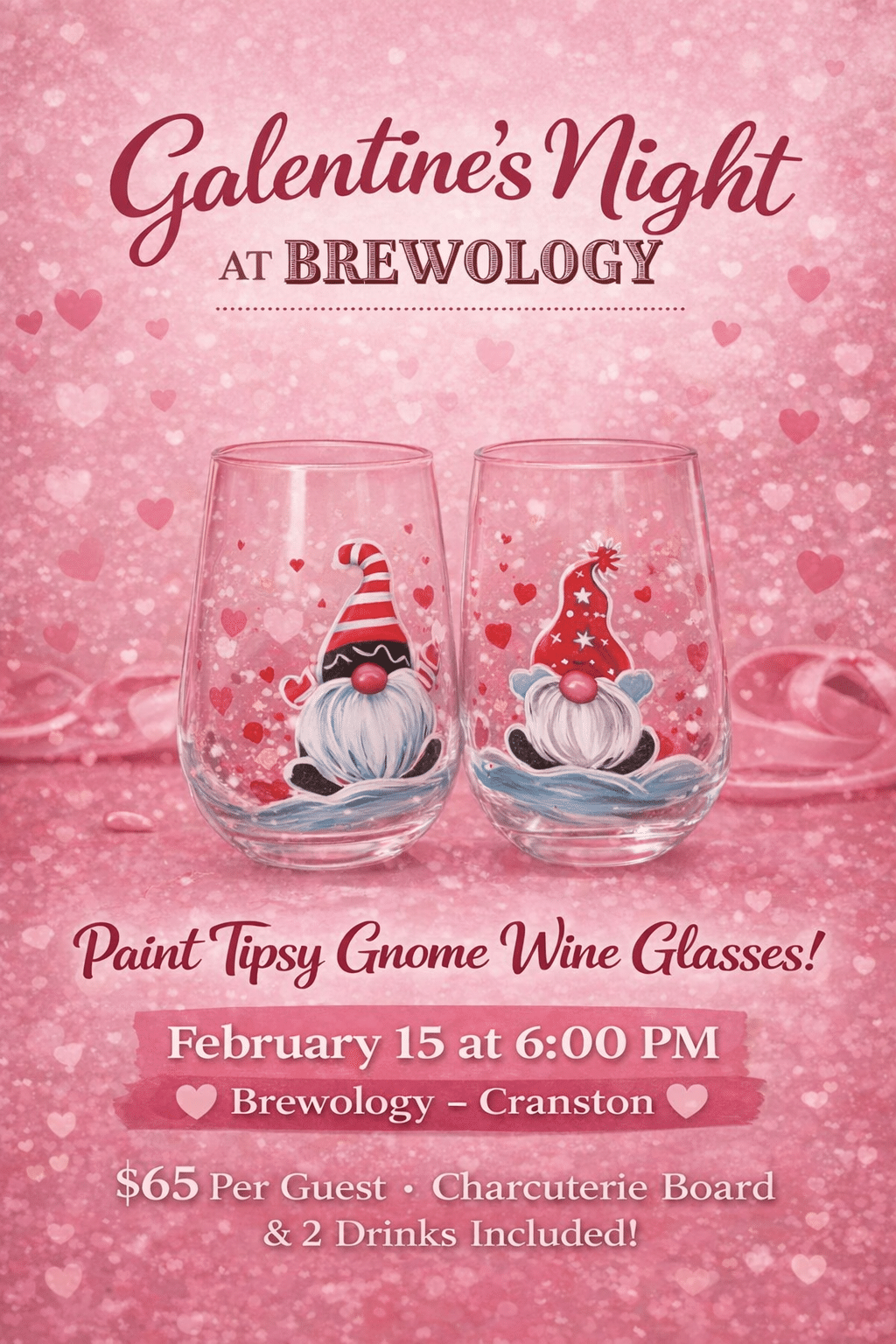 Grab your girlfriends and join us for a fun-filled Galentine’s Night at Brewology! 🎨🍷 Paint adorable Tipsy Gnome wine glasses while sipping drinks, snacking on a delicious charcuterie board, and enjoying a relaxed, creative night out. No experience needed—just come ready to laugh, sip, and create!
