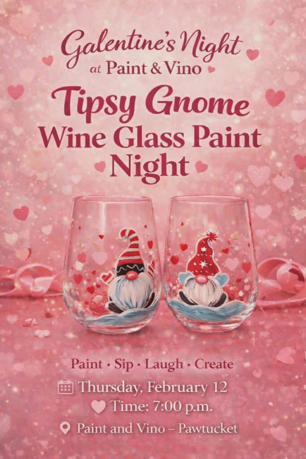 Grab your girls and join us for a fun & festive Galentine’s Night at Paint and Vino! In this relaxed, beginner-friendly class, you’ll paint an adorable Tipsy Gnome wine glass featuring hearts, sparkle details, and Valentine vibes.